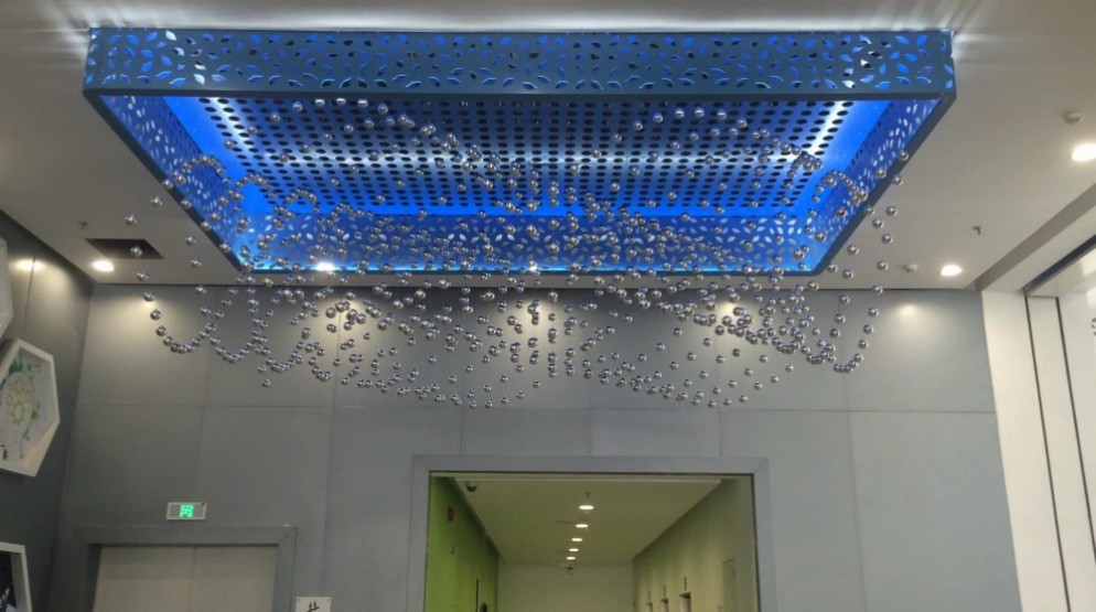展項(xiàng)由大型的小球動(dòng)態(tài)演示組成。小球矩陣懸掛在展廳上空,它集成了運(yùn)動(dòng)控制、伺服技術(shù)、機(jī)械結(jié)構(gòu)、計(jì)算機(jī)程序、圖形像素、視覺(jué)藝術(shù)和音樂(lè)表現(xiàn)等多種學(xué)科的技術(shù),每個(gè)小球在計(jì)算機(jī)的控制下井然有序地運(yùn)動(dòng),演繹著曲線、曲面、平面、文字和三維圖案等各種動(dòng)態(tài)造型,整體效果如同一副流光溢彩的立體畫(huà),是科技與藝術(shù)的完美結(jié)合,是當(dāng)今新媒體現(xiàn)代藝術(shù)演示的最新成果。