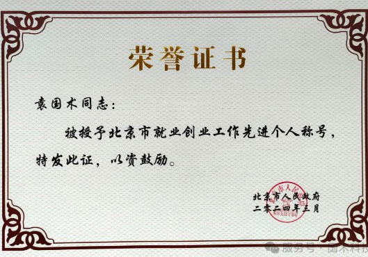 袁國術榮獲“北京市就業(yè)創(chuàng)業(yè)工作先進個人”稱號