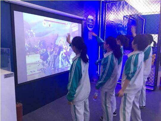在賽未來(lái)Sciwill投影屏幕前,我們看到,來(lái)自首都師范大學(xué)附屬中學(xué)的同學(xué)們,三五成群,蹦蹦跳跳,手舞足蹈,歡樂(lè)嗨皮中還連聲不斷地發(fā)出驚嘆聲:“好神奇啊”。