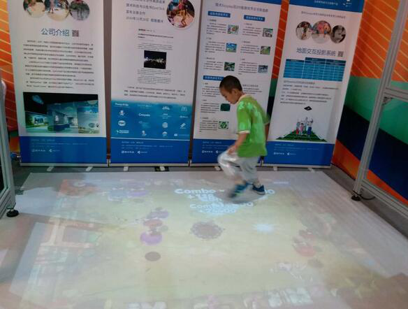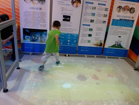 這款名為“國術Eyeplay”交互投影產品是國術科技(北京)有限公司與EyeClick(以色列)強強聯(lián)合的創(chuàng)新產物,此次在北京科技周上的人氣爆棚就充分說明了這一點。它是通過地面投影系統(tǒng)、桌面投影系統(tǒng)和墻面投影系統(tǒng)的綜合應用,能將任何物理空間變成一個身臨其境的、令人興奮的互動娛樂體驗場景?!啊畤gEyeplay’交互投影產品的出現(xiàn),讓科普不再局限于圖文、視頻播放、解說、3D電影等傳統(tǒng)形式,而是以互動娛樂的方式,讓觀眾親身參與進來,成為虛擬空間中的一部分,新奇、有趣,體驗感強烈,一出場就成為吸引孩子們的高科技交互玩具。”國術科技(北京)有限公司項目負責人彭小國補充說。