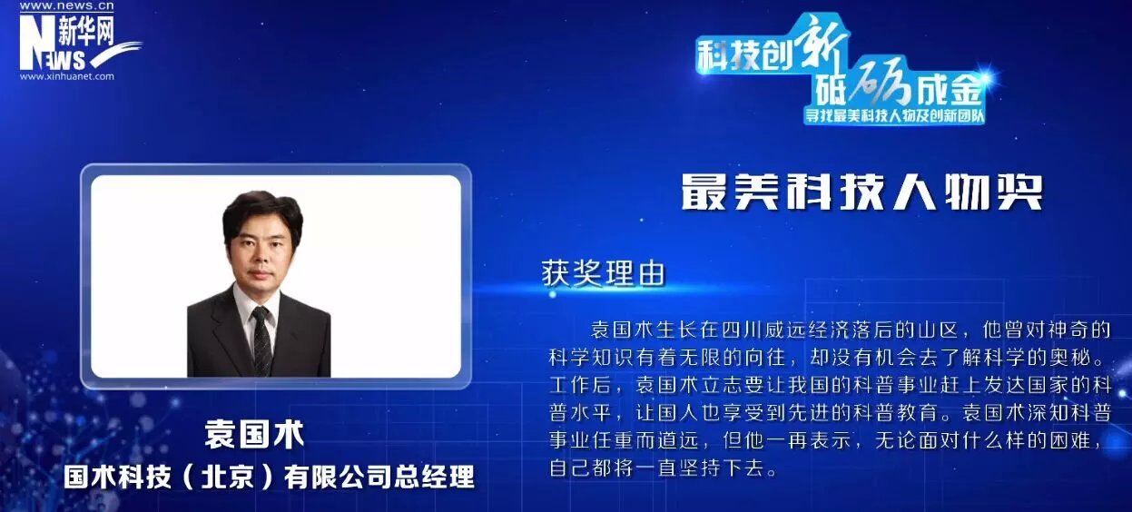 2015年5月17日, 新華網(wǎng)“科技創(chuàng)新 砥礪成金”——尋找最美科技人物及創(chuàng)新團(tuán)隊(duì)頒獎(jiǎng)盛典在北京民族文化宮劇院成功舉辦。此次活動(dòng)由中宣部、科技部、信息和工業(yè)化部、新華社等單位指導(dǎo),北京市科學(xué)技術(shù)委員會(huì)支持,新華網(wǎng)主辦。國術(shù)科技(北京)有限公司總經(jīng)理袁國術(shù)博士獲得“最美科技人物”獎(jiǎng),據(jù)悉這是科普教育工作者首次獲得此項(xiàng)殊榮。