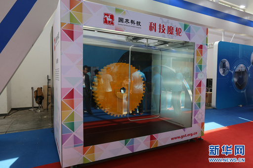 記者在看到科技魔輪頗具魔術(shù)色彩。一只巨大的橙紅色輪子慢慢轉(zhuǎn)動著,一個高度大于輪子直徑的長方形鐵圈從輪子左側(cè)出發(fā),向右穿過輪子的圓心,而后又轉(zhuǎn)90度,從輪子右側(cè)穿出來??吹竭@樣的奇景,市民普遍認為輪子是依靠磁懸浮一類的高科技手段才得以保持位置并且旋轉(zhuǎn)的。國術(shù)科技袁國術(shù)博士向記者解釋說,“輪子懸空是個假象,事實上,輪子是一個偏心輪,鐵圈變換角度和反復(fù)穿過它的時候,剛好能避開它的軸。這個展品借鑒了精密機床“五軸四聯(lián)動”的設(shè)計技術(shù)”。