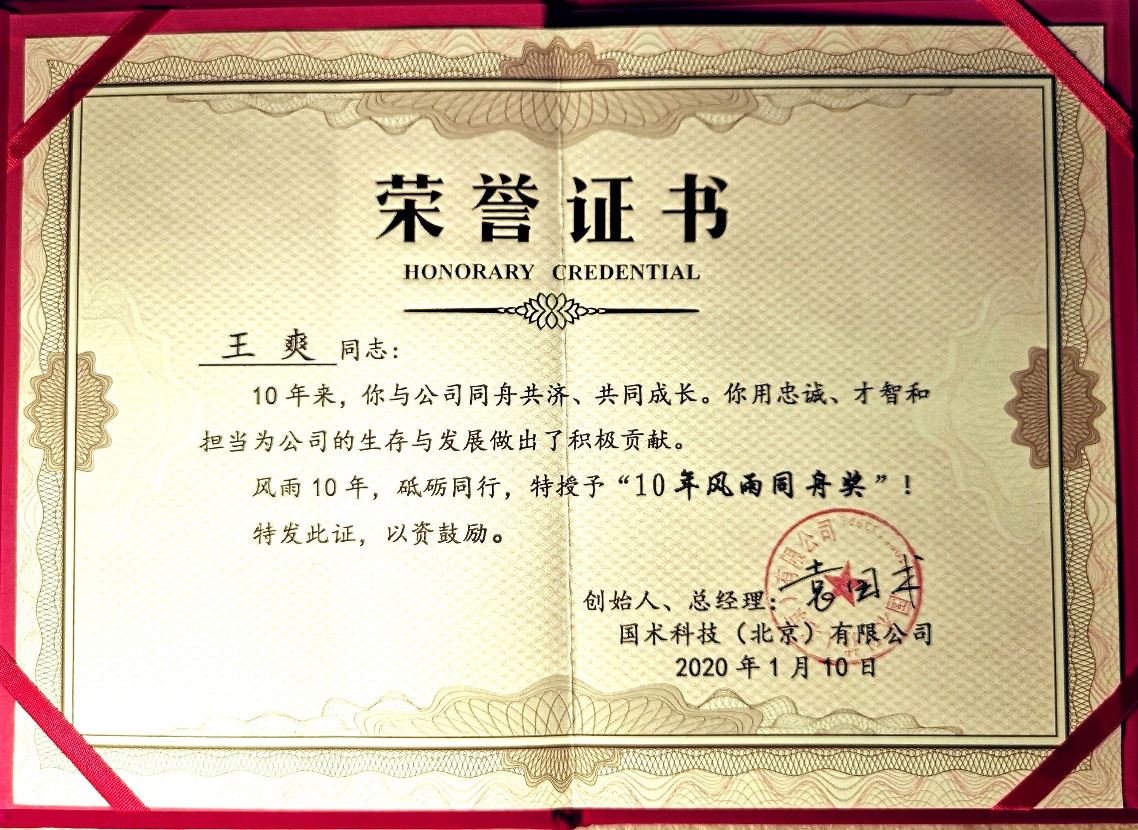 過去的十年,是艱苦奮斗的十年,是同舟共濟(jì)的十年。國術(shù)科技的發(fā)展,離不開每一位國術(shù)科技人的不懈努力和辛勤付出。盛會現(xiàn)場,公司舉行了隆重的頒獎儀式,對王爽等26名5年以上員工進(jìn)行了表彰,分別授予 “十年風(fēng)雨同舟獎”“九年風(fēng)雨同舟獎”“八年風(fēng)雨同舟獎”“七年風(fēng)雨同舟獎”“六年風(fēng)雨同舟獎”“五年風(fēng)雨同舟獎”。公司對入職5年內(nèi)的優(yōu)秀員工進(jìn)行了表彰,對王欣欣等分別授予 “金算盤獎”“最佳奉獻(xiàn)獎”“攻堅克難獎”。