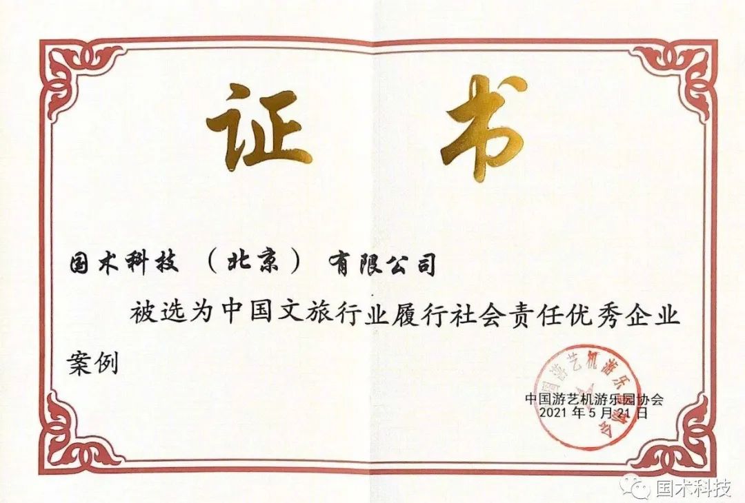 本次大會(huì)上,國(guó)術(shù)科技入選 “中國(guó)文旅行業(yè)履行社會(huì)責(zé)任優(yōu)秀企業(yè)案例”榜單,并獲中國(guó)游藝機(jī)游樂園協(xié)會(huì)頒發(fā)證書,以表彰國(guó)術(shù)科技在疫情期間守護(hù)員工成長(zhǎng)、傳遞公司溫暖的先進(jìn)事跡。