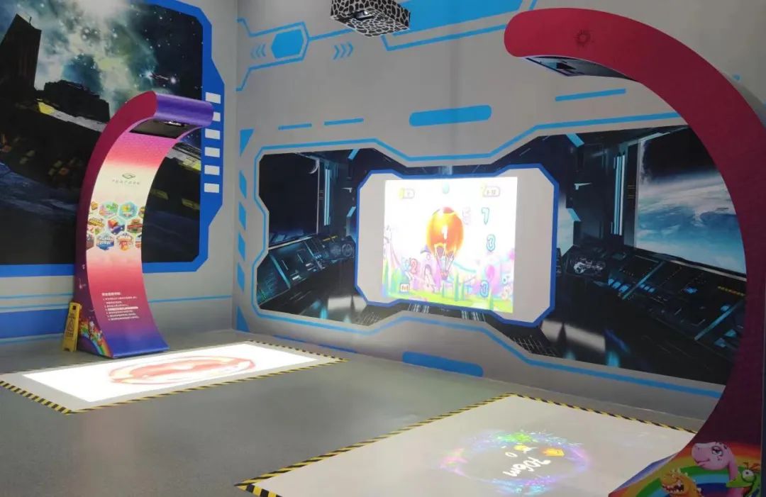 尤其值得一提的是國(guó)術(shù)科技為科普的主陣地科技館特別開發(fā)的一款“賽未來(lái)商用教育游戲機(jī)器人”,內(nèi)含200多套益智類、競(jìng)技類、科普類等趣味科普節(jié)目可供選擇,將這些節(jié)目投射到10平方米左右的地面、墻面,營(yíng)造出的是一個(gè)沉浸式的科普互動(dòng)空間。這小小的10平方米仿佛是一扇“任意門”,通過(guò)切換節(jié)目可以將孩子們瞬間帶到沙漠、叢林、海底世界等不同場(chǎng)景。
