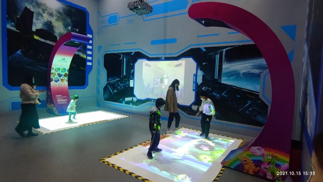 這是一個多媒體互動投影游戲,相當于把地面、桌面變成了具有3D效果的超大“Ipad”,手和腳則化身為神奇的“鼠標”,很多經(jīng)典的游戲,都可以通過“蹦蹦跳跳”的方式來完成。