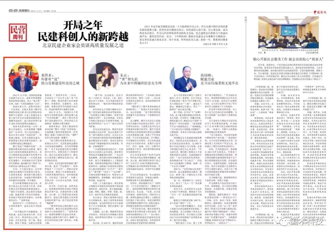 【《中國新聞》報 記者 李騰飛 作者 孔夏 報道】2023年是全面貫徹落實(shí)黨的二十大精神的開局之年。作為支撐中國經(jīng)濟(jì)高質(zhì)量發(fā)展的重要力量,民營經(jīng)濟(jì)在爬坡過坎后,如何強(qiáng)信心鼓干勁、安心謀發(fā)展,成為輿論關(guān)注焦點(diǎn)。作為與經(jīng)濟(jì)界聯(lián)系密切的民主黨派,民主建國會長期致力于搭建溝通平臺,服務(wù)民營經(jīng)濟(jì)。近日,《中國新聞》報聯(lián)合民建北京市委推出專題報道,采訪多位民建企業(yè)家會員。對于未來,聽聽他們怎么說;新的一年,看看他們準(zhǔn)備怎么干?
