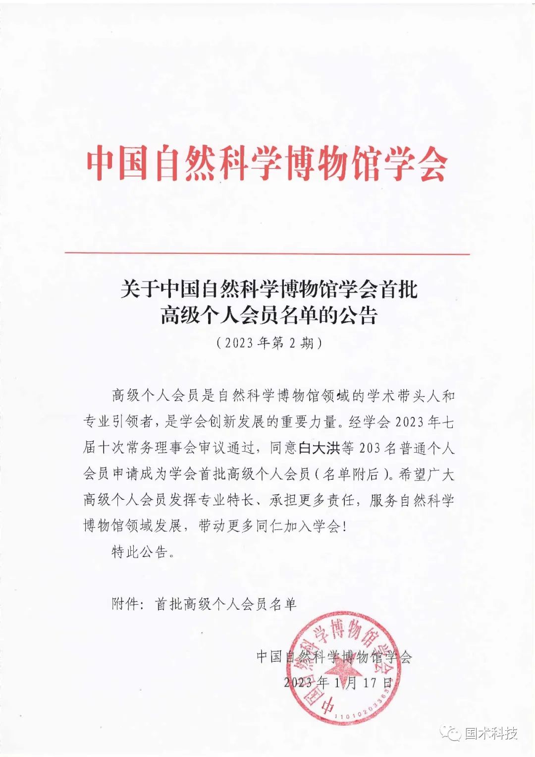 2023年1月17日,中國自然科學博物館學會發(fā)布《關于中國自然科學博物館學會首批高級個人會員名單的公告》。經(jīng)學會2023年七屆十次常務理事會審議通過,同意國術科技袁國術、彭小國、王曄等3位同志成為學會首批高級個人會員。