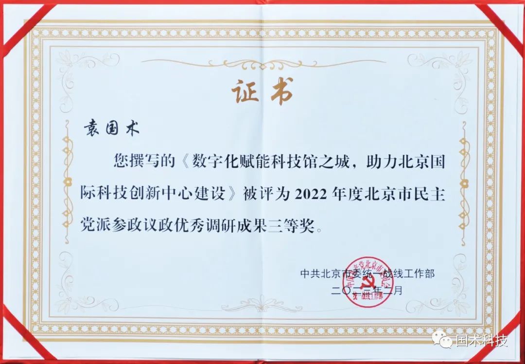 由袁國術主筆撰寫的《數(shù)字化賦能科技館之城,助力北京國際科技創(chuàng)新中心建設》調(diào)研報告,被中共北京市委統(tǒng)戰(zhàn)部評為“2022年度北京市民主黨派參政議政優(yōu)秀調(diào)研成果三等獎”。