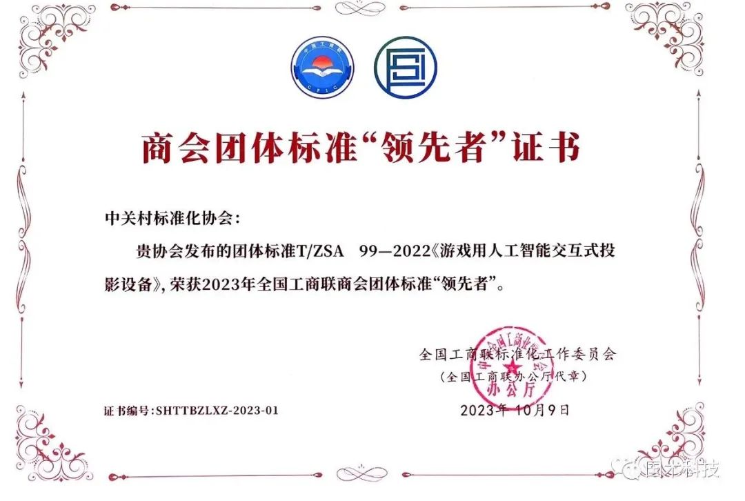 由國術科技牽頭制定,中關村標準化協(xié)會發(fā)布的《游戲用人工智能交互式投影設備》團體標準,榮獲2023年全國工商聯(lián)商會團體標準“領先者”。