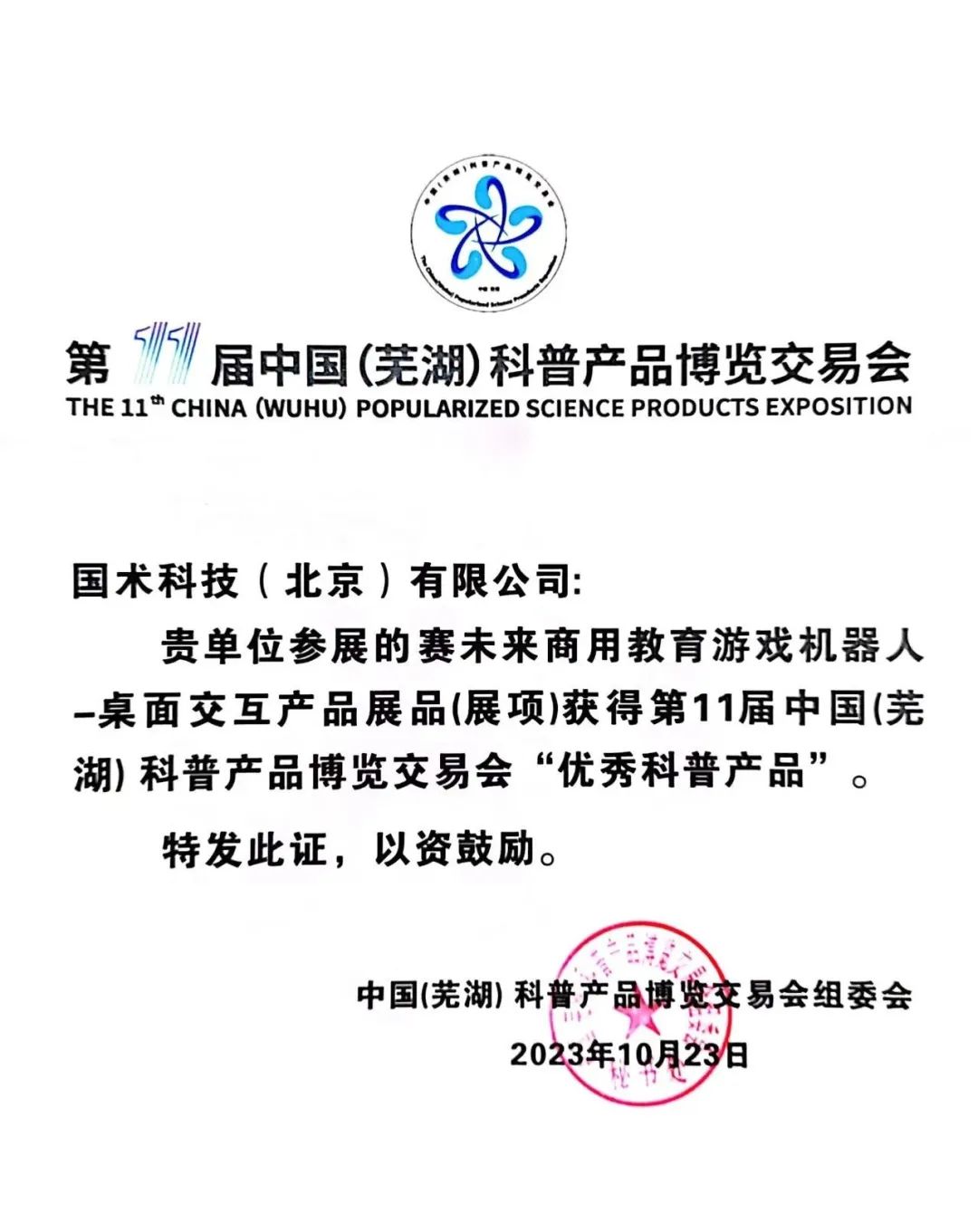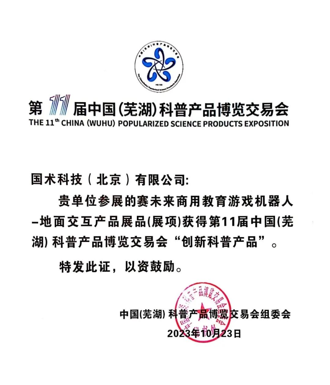 賽未來商用教育游戲機器人地面交互、桌面交互產(chǎn)品分別獲得第11屆中國(蕪湖)科普產(chǎn)品博覽交易會“創(chuàng)新科普產(chǎn)品”“優(yōu)秀科普產(chǎn)品”獎。