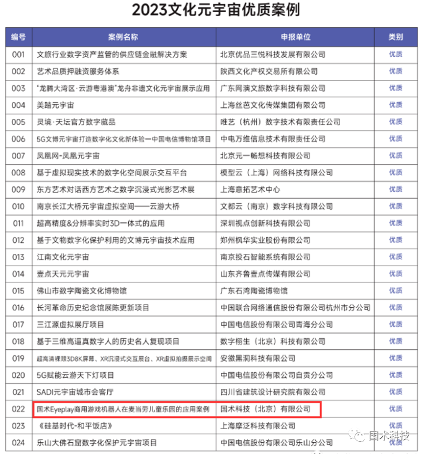 “國術Eyeplay商用游戲機器人在麥當勞兒童樂園的應用案例”被中國文化產(chǎn)業(yè)協(xié)會文化元宇宙專業(yè)委員會評選為“2023年文化元宇宙優(yōu)質(zhì)案例”。