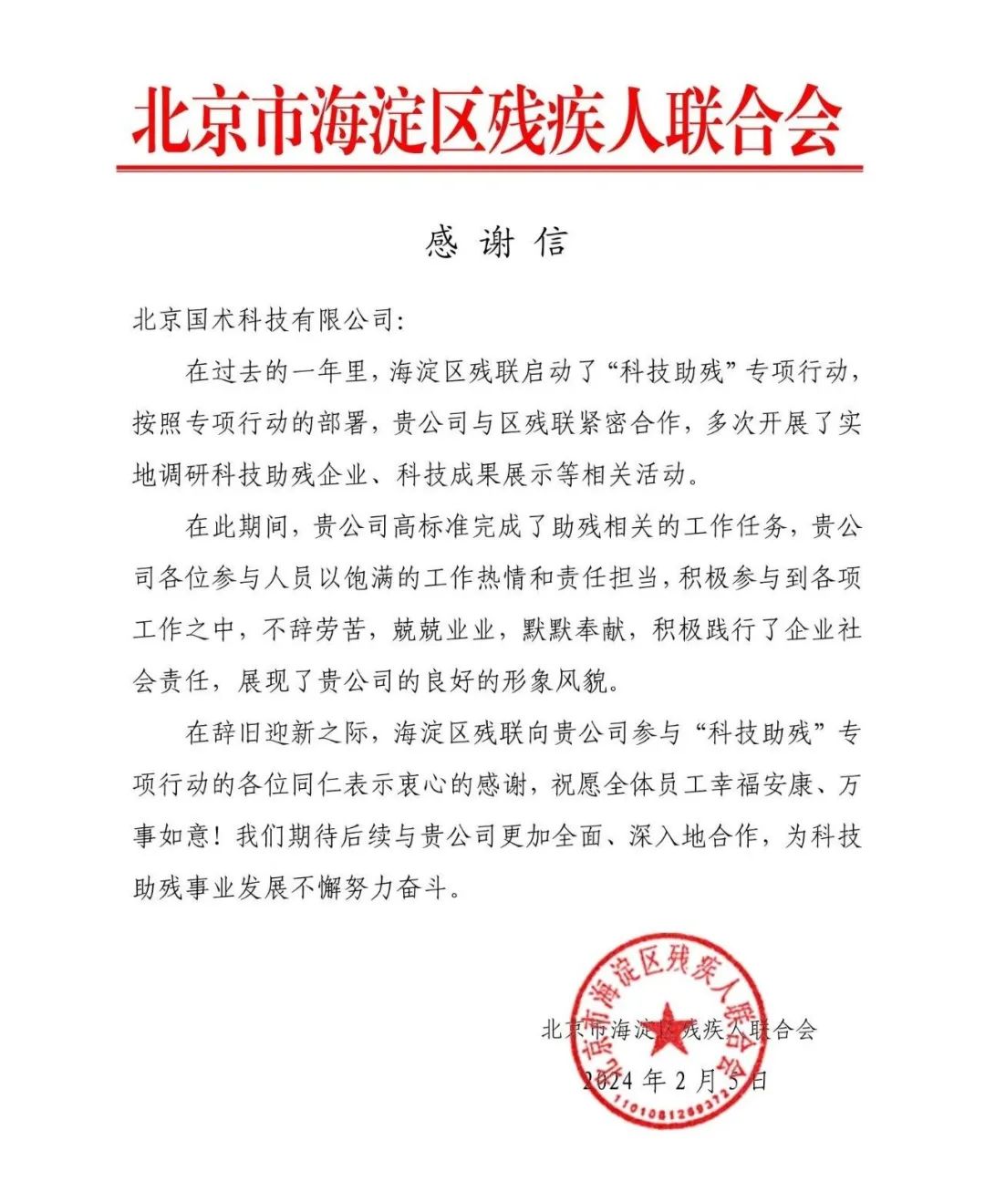 近日,國術(shù)科技收到一封來自北京市海淀區(qū)殘疾人聯(lián)合會的感謝信,信中肯定了國術(shù)科技為“科技助殘”專項行動所做的貢獻,向各位參與人員表示衷心的感謝。