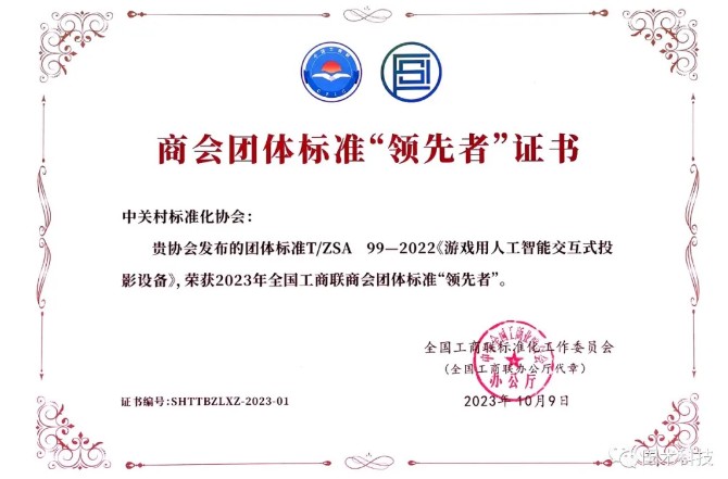 基于在人工智能交互投影技術(shù)方面的領(lǐng)先優(yōu)勢,國術(shù)科技牽頭制定了《游戲用人工智能交互式投影設(shè)備》團體標(biāo)準(zhǔn),填補了國內(nèi)外該類產(chǎn)品標(biāo)準(zhǔn)的空白。該標(biāo)準(zhǔn)于2021年12月被中關(guān)村標(biāo)準(zhǔn)化協(xié)會認(rèn)定為“中關(guān)村標(biāo)準(zhǔn)”團體標(biāo)準(zhǔn),于2023年10月被評為“2023年全國工商聯(lián)商會團體標(biāo)準(zhǔn)‘領(lǐng)先者’”。