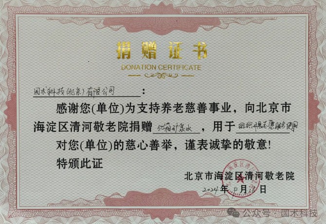 國術(shù)科技收到了來自清河敬老院頒發(fā)的捐贈證書