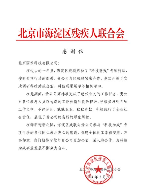 國術(shù)科技積極參與“科技助殘”專項(xiàng)行動(dòng),收到海淀區(qū)殘聯(lián)感謝信。