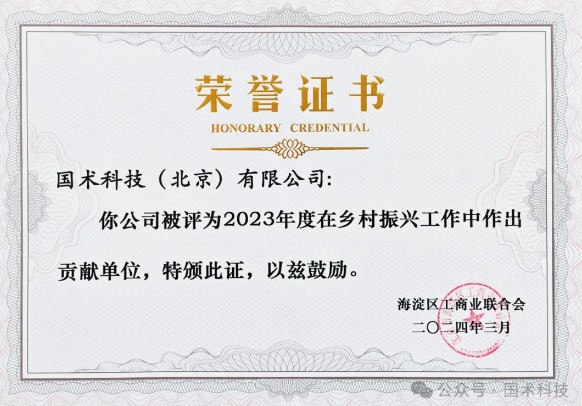國術(shù)科技被海淀區(qū)工商聯(lián)評為“2023年度在鄉(xiāng)村振興工作中做出貢獻(xiàn)單位”。