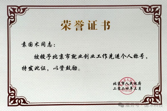 袁國術(shù)被北京市政府授予“北京市就業(yè)創(chuàng)業(yè)工作先進(jìn)個(gè)人”稱號。