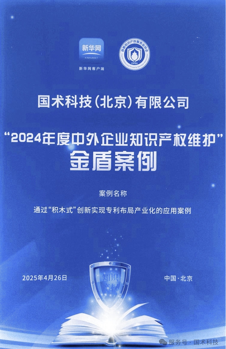 2025年2月24日,新華網(wǎng)客戶端與首都知識產(chǎn)權(quán)服務(wù)業(yè)協(xié)會聯(lián)合啟動了“2024年度中外企業(yè)知識產(chǎn)權(quán)維護典型案例”征集活動。經(jīng)過征集和篩選,最終有41個案例入圍。國術(shù)科技報送的“通過‘積木式’創(chuàng)新實現(xiàn)專利布局產(chǎn)業(yè)化的應(yīng)用案例”入圍“2024年度中外企業(yè)知識產(chǎn)權(quán)維護金盾案例”。