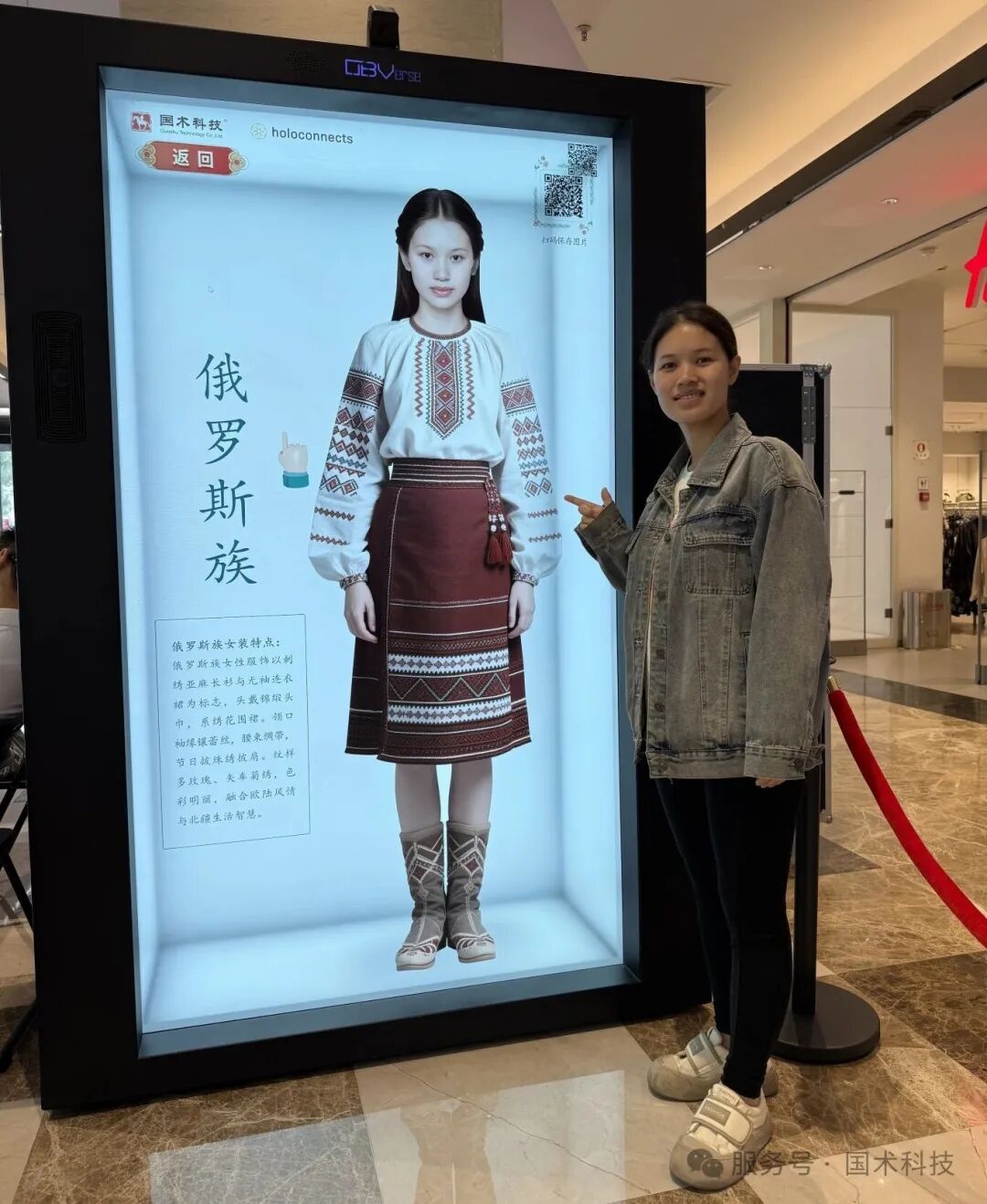 與此同時,國術科技的另一產(chǎn)品“民族服飾AI換裝”也受到觀眾的喜愛?!爸灰獡]揮手,就能瞬間試穿民族服飾,生成美圖,現(xiàn)在的科技也太神奇了!”一位體驗者感嘆道。體驗者通過手勢操作即可輕松選擇心儀的民族服飾“上身”試穿,試穿圖像會在“OBVerse奧比全息艙”中以4K超高清裸眼3D的形式精彩呈現(xiàn),讓體驗者沉浸式體驗民族服飾的美學魅力與文化風情。同時,體驗者還可以掃碼保存標有活動主題詞的高清圖像,構建“體驗-留存-分享”的完整閉環(huán),助力民族服飾文化廣泛傳播。