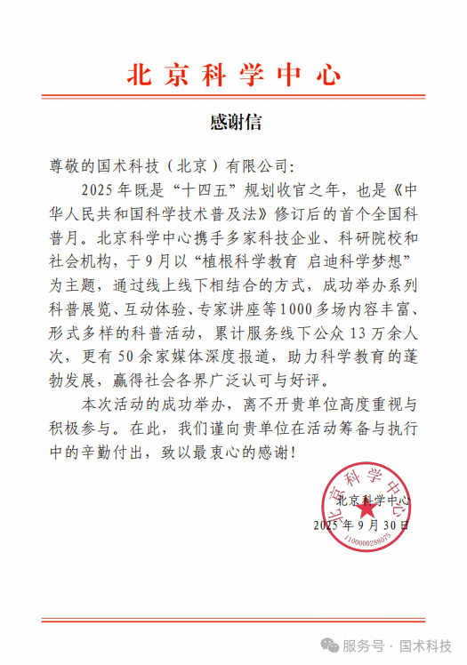 近日,國術(shù)科技收到了來自北京科學(xué)中心的感謝信。在信中,北京科學(xué)中心對國術(shù)科技在2025年首個全國科普月期間,積極參與北京科學(xué)中心舉辦的系列科普活動表示衷心的感謝。