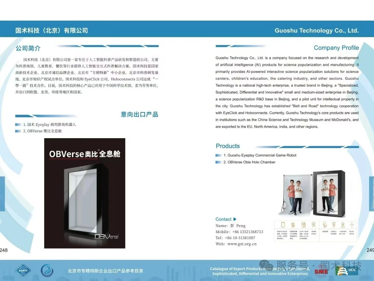 1.國術(shù)科技參加第二十七屆中國北京國際科技產(chǎn)業(yè)博覽會專精特新“京品出?!蓖平榻涣鲿?,現(xiàn)場展示了“OBVerse奧比全息艙+復(fù)刻數(shù)字人”。該產(chǎn)品入選《北京市專精特新企業(yè)出口產(chǎn)品參考目錄》。