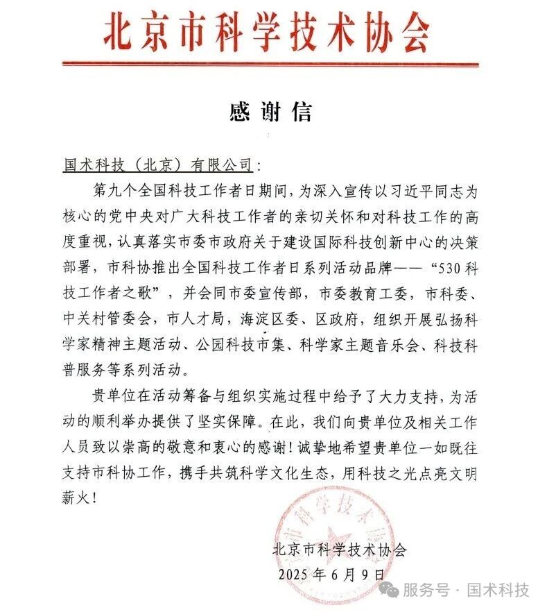 3.國術(shù)科技積極支持全國科技工作者日系列活動,收到北京市科學(xué)技術(shù)協(xié)會感謝信。