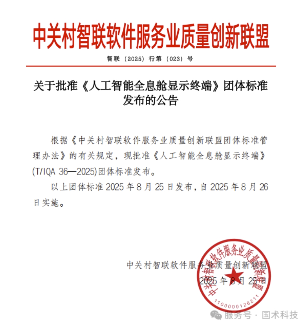 3.由國術(shù)科技聯(lián)合中關(guān)村智聯(lián)軟件服務(wù)業(yè)質(zhì)量創(chuàng)新聯(lián)盟等單位牽頭起草的《人工智能全息艙顯示終端》(T/IQA 36—2025)團(tuán)體標(biāo)準(zhǔn)發(fā)布。