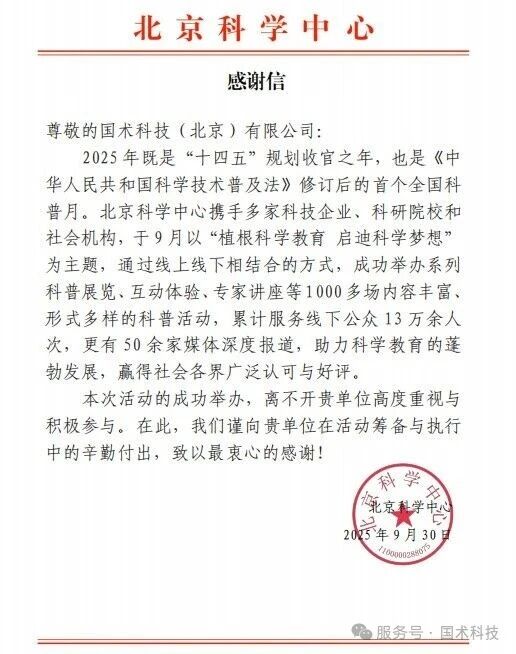 1.國術(shù)科技在2025年首個全國科普月期間,積極參與北京科學(xué)中心舉辦的系列科普活動,收到北京科學(xué)中心感謝信。